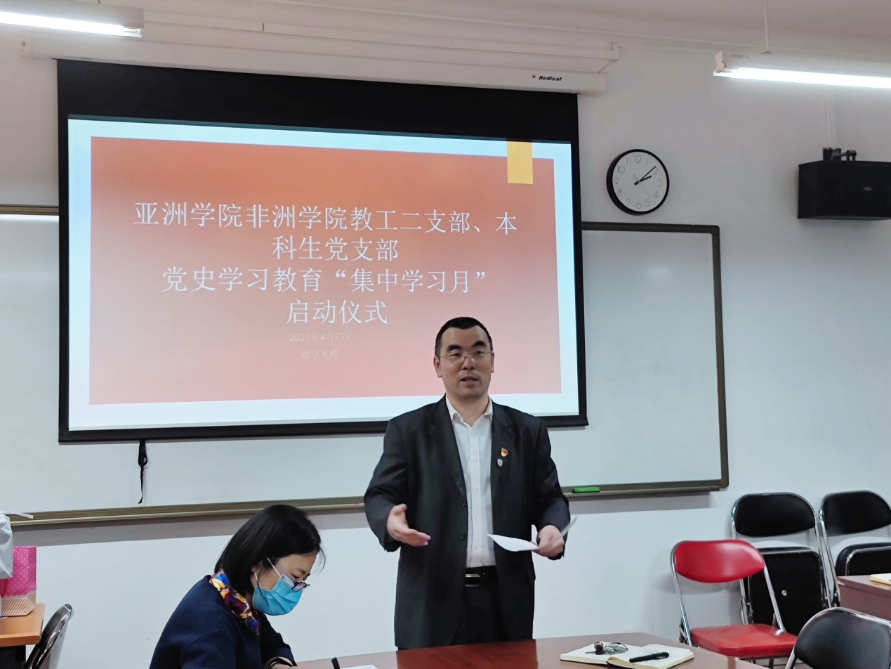 2021年4月7日,太阳集团tyc9728、非洲学院党总支举办党史学习教育“集中学习月”启动仪式暨第一次集中学习活动。党总支书记许晔、非洲学院院长李洪峰、教工二支部及本科生支部三十多名同志参加了主会场活动。教工一支部、研究生党支部在各自的分会场开展学习。