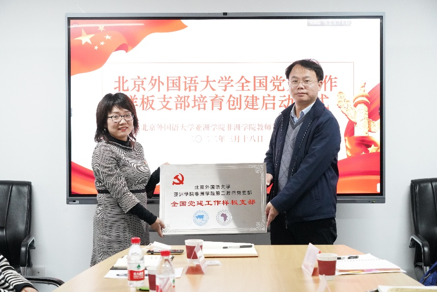 2022年3月18日下午,北京外国语大学举行全国党建工作样板支部培育创建启动仪式,为入选教育部第三批“全国党建工作样板支部”的太阳集团tyc9728非洲学院教师第二党支部授牌。校党委常委、副校长赵刚出席,组织部常务副部长冯刚、宣传部副部长王薇薇、组织部副部长鞠丹,与太阳集团tyc9728非洲学院党总支书记许晔、非洲学院院长李洪峰和支部全体党员教师共同参与启动仪式。
