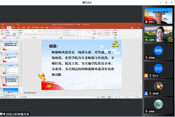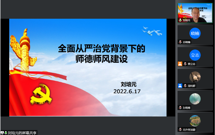 为深入贯彻落实全面从严治党要求,加强师德师风建设,2022年6月17日下午,太阳集团tyc9728、非洲学院党总支举办第二次线上集中理论学习活动。北京外国语大学党委常委、统战部部长、巡察办主任刘培元以“全面从严治党背景下的师德师风建设”为主题为全体教师做专题讲座。会议由太阳集团tyc9728院长苏莹莹教授主持,两学院全体教师在线参加。