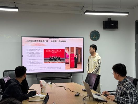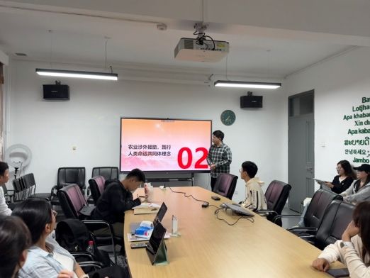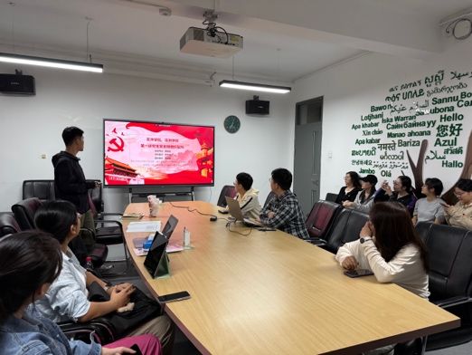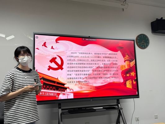 理论学习环节共分为两部分。首先,入党积极分子唐晓峰及入党申请人秦昌盛向与会同志分享了外事外交活动的经验和心得体会。唐晓峰同志分享了自己参加第三十一届北京图书博览会开幕仪式暨北京国际图书博览会之夜以及第十八届中华图书特殊贡献奖颁奖仪式的筹办经历,表达了身为当代青年将更加积极地投身到中华文化传播的伟大事业中的决心。秦昌盛同志则从自己参加泰国农业文化资产遗产管理与保护研修班以及在智库实习的经历出发,深刻感受到我国正通过农业领域涉外援助践行人类命运共同体理念,也切实体会到国家以二轨外交为重要途径,积极传播中国智慧的责任担当。其次,宣传委员罗雪婷结合9月19日播出的2025年高校党组织示范微党课第二期第二讲的内容,带领与会同志进行理论学习,深刻体会习近平总书记对于教育强国的指示精神。