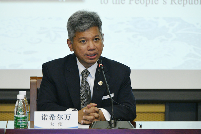 讲座中,诺希尔万回顾了中国与马来西亚、东盟关系的发展历史,阐释了中国在东盟发展中的重要作用,希望通过发展贸易来实现中国、马来西亚及东盟经济的持续增长和繁荣。诺希尔万希望中国与马来西亚之间能建立新的健康对话关系,在未来展开更加诚实、开放的对话合作。