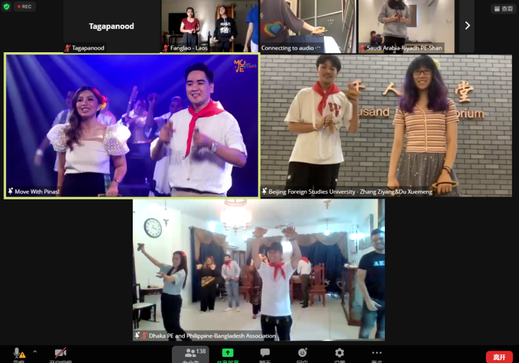 在学习成果展示环节,杜雪萌、张梓洋同学积极举手参与,与来自其它国家的伙伴隔空互动,在舞蹈中体验菲律宾文化;石惟扬同学在活动大屏上发言,表达了参与活动的激动心情与对主办方的感谢,受到主办方的赞赏。在舞蹈活动最后,北外菲律宾语学生代表手持舞蹈道具、穿戴菲律宾民族传统饰品,于会议公屏上与各国参与者共欢共舞。在跨文化的交流学习下,四名同学不仅领略了对象国热情洋溢的民俗,而且更深刻地感受到对象国文化的生命力与感染力,也将以更饱满的朝气投入到对象国语言的学习中。