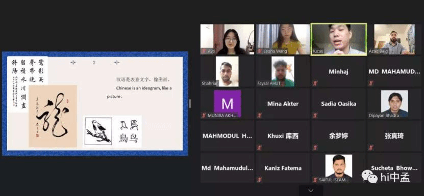 根据调研的结果,每场讲座分为两部分,一部分是汉字学习方法,另一部分是中国文化知识。讲座中,两位老师介绍了中国的各类文化现象,如大熊猫、中国省市区划、十二生肖、春节、中国八大菜系和人工智能等,在汉语学习方面讲解了拼音、声调、汉字、古汉字等,推荐了中国有名的新闻网站以及汉语教学机构孔子学院等高效的线上汉语学习资源,还通过对话的方式带领参会者练习了中文沟通,每场讲座最后还准备了问答环节来解决孟加拉国朋友们的困惑。在讲座中,小组成员还利用孟加拉语专业知识,对一些知识点进行了孟加拉语-汉语讲解。爱琳老师还结合自己在英国孔院的工作经历,和参会者讨论了中文、英文、孟加拉语交流用语上的差异,这些都凸显了讲座跨文化交流的特色。