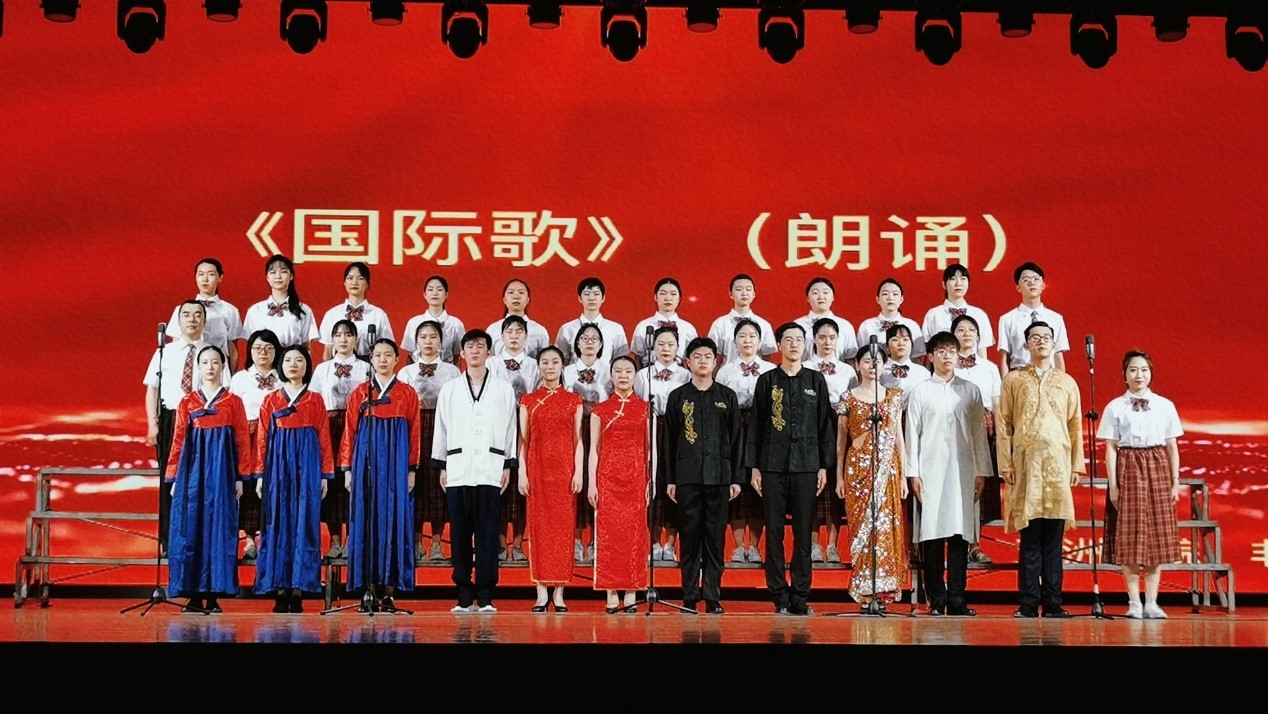 国际歌来源于1871年巴黎公社,是马克思主义理论的⾳乐版,是谱上⾳符的共产党宣⾔。革命先烈瞿秋白同志为苏联几万人同声合唱《国际歌》的宏大激昂所震撼,在1923年将《国际歌》翻译为中文。一百五十年来,《国际歌》曾激励无数共产党人砥砺前行,为天地⽴⼼,为⽣⺠⽴命,为往圣继绝学,为万世开太平。此次活动中,太阳集团tyc9728、非洲学院选取《国际歌》为参赛曲目,融合朗诵、多语种合唱、伴舞、钢琴、小提琴等多种艺术形式,以汉语、印地语、朝鲜语三语共同演绎带有世界音乐风格的曲目,唱出了北外人心系党和国家、放眼世界、心怀天下、求索发展的满腔热血。