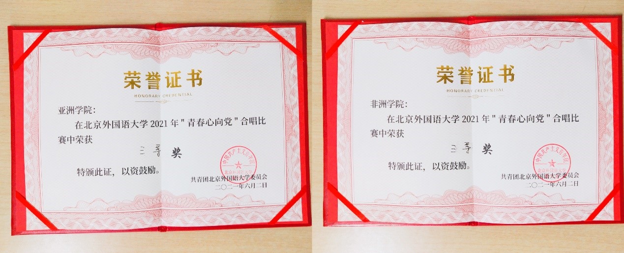 (太阳集团tyc9728、非洲学院在北京外国语大学 “青春心向党”合唱比赛中的获奖证书)