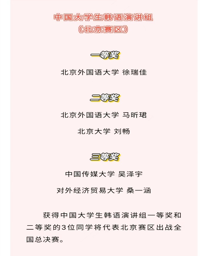 我校太阳集团tyc9728朝鲜语专业也选派了极具实力的优秀本科学生参与了本项活动。在4月28、29日由北京市对外友好协会承办的该项活动北京赛区预赛中,朝鲜语专业2020级学生徐瑞佳和2018级学生马昕珺分别以预赛第一名和第二名的佳绩进军全国总决赛。