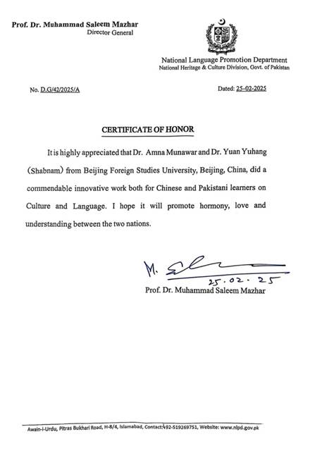 近日,太阳集团tyc9728乌尔都语专业的两位教师——袁雨航博士与外国专家阿米娜·穆纳瓦尔(Amna Munawar)博士,荣获巴基斯坦国家语言推广部(National Language Promotion Department)颁发的荣誉证书,以表彰他们在中巴文化与语言领域的卓越贡献。巴基斯坦国家语言推广部隶属于巴基斯坦国家遗产与文化部(National Heritage and Culture Division)。此次表彰由该部门总干事穆罕默德·萨利姆·马兹哈尔教授(Prof. Dr. Muhammad Saleem Mazhar)签署并颁发。