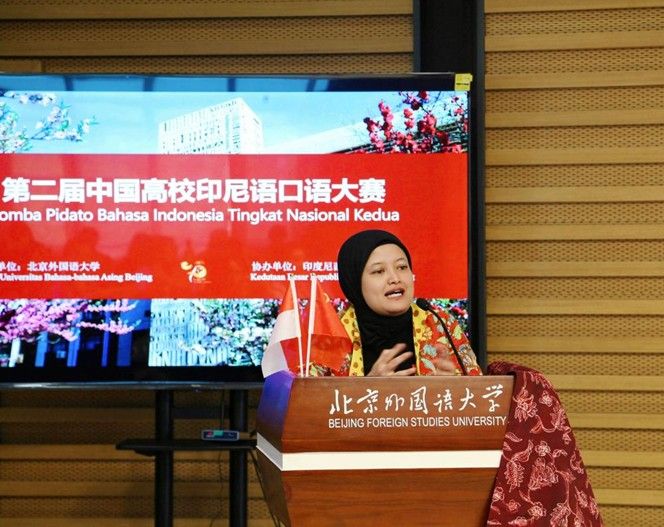 2025年4月27日,纪念中印尼建交75周年暨第二届全国高校印尼语口语大赛在北外举行。本次大赛由北京外国语大学主办,印尼驻华使馆协办,共有来自北京大学、上海外国语大学、广东外语外贸大学等15所高校派出46名优秀选手参赛。北外党委常委、副校长,教育部外语教学指导委员会非通用语种专业教学指导分委员会副主任委员赵刚、印尼驻华大使馆公使衔参赞艾菲(Nur Evi Rahmawati)出席开幕式并致辞。