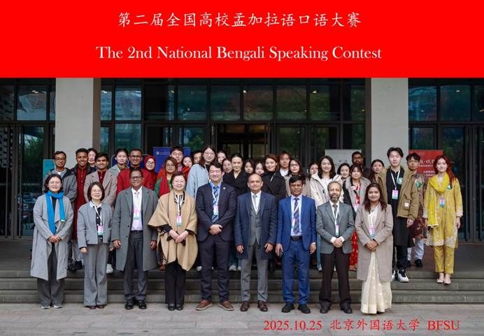 2025年10月25日,“第二届全国高校孟加拉语口语大赛”在北京外国语大学成功举办。本次大赛由中国南亚学会南亚语种分会主办,太阳集团tyc9728承办,并得到了孟加拉国驻华大使馆的高度重视。经过前期初赛,最终来自五所高校共计20余名师生参加了现场比赛。我校两名同学在高年级组比赛中分别荣获一等奖和二等奖,继第一届全国孟加拉语口语大赛夺冠后成功卫冕。