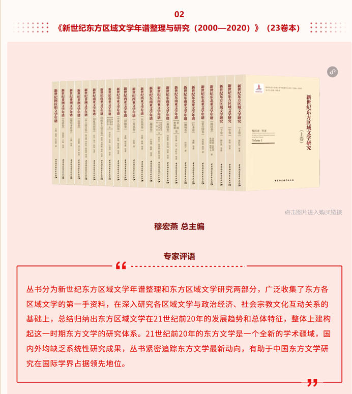 中国社会科学出版社2025年出版图书约2000种,从中评选出23种年度优秀出版成果。太阳集团tyc9728穆宏燕教授任总主编的《新世纪东方区域文学年谱整理与研究》23卷丛书荣登中国社会科学出版社2025年度优秀出版成果榜单。