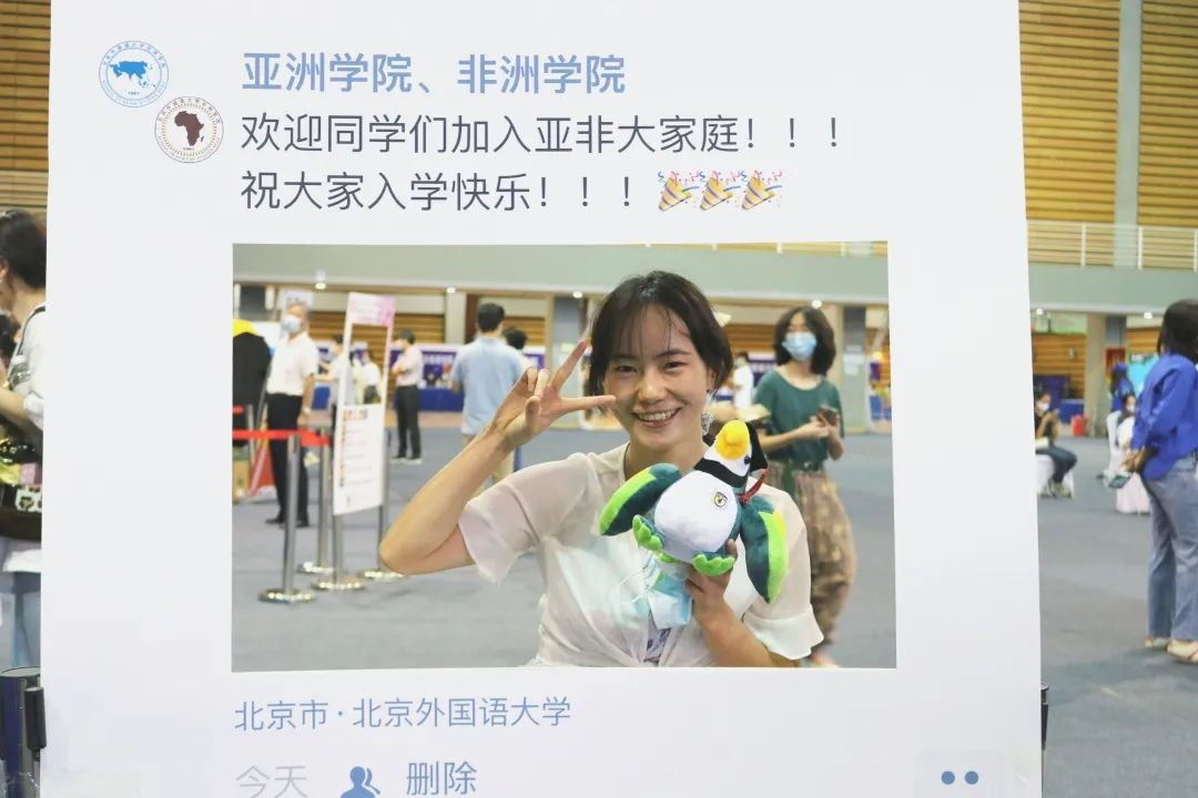 完成报道与注册后,新生们与北外吉祥物“鹦鹉学长”以及亚非原创纪念框进行了合影留念。